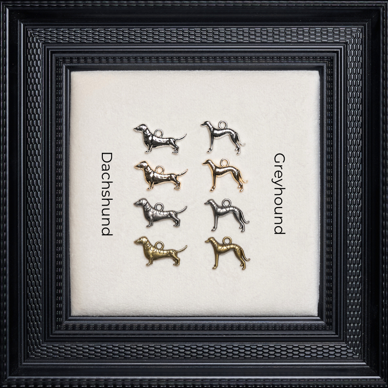 Our metal dog charm is available in silver, gold, brass, and antique silver finishes. Specify your preferred finish at checkout.