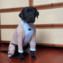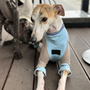 Part of our "Urban Exploration" Collection.Spend your holiday by taking a trip down to the French Riviera with the St. Tropez Onesie supporting your dog’s every move. The pale aqua collar and trim reflect the tranquil blue waters, while the pearl grey bodice mimics the sand - perfect for peaceful strolls along the beach. Plus, its slim silhouette provides an air of opulence that other dogs will recognize with a single sniff.