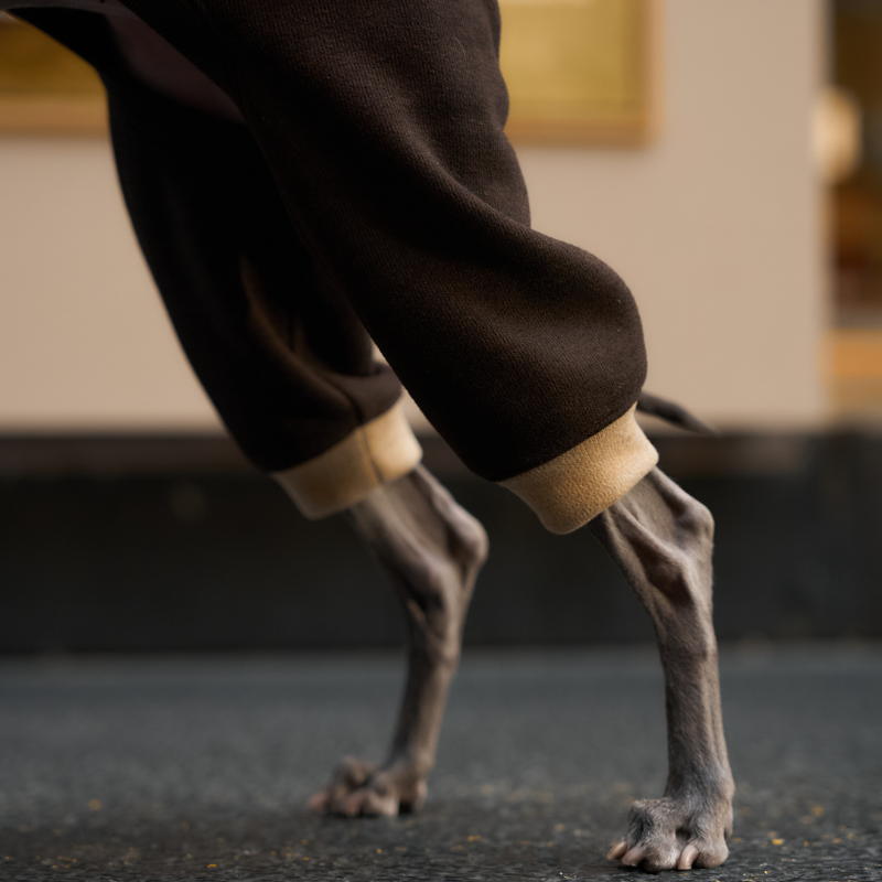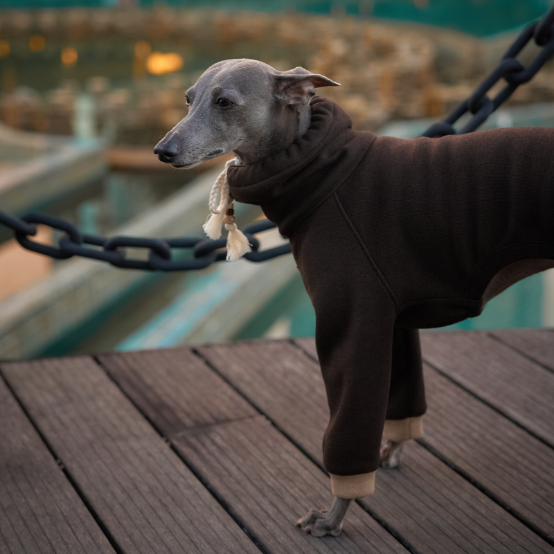 Introducing the SERGE Wool Onesie—a statement in cozy sophistication for your four-legged companion. Crafted in a decadent dark chocolate brown wool blend and accented with creamy contrast cuffs, this piece redefines luxury loungewear for dogs. Inspired by easygoing “hobo” fashion and tailored for the modern pup, the Serge Onesie effortlessly blends high design with everyday practicality. This thoughtfully designed dog onesie features a signature braided string threaded with a delicate bead, allowing you to adjust the collar for just the right fit—tightly cinched for extra warmth or worn open for a laid-back look.